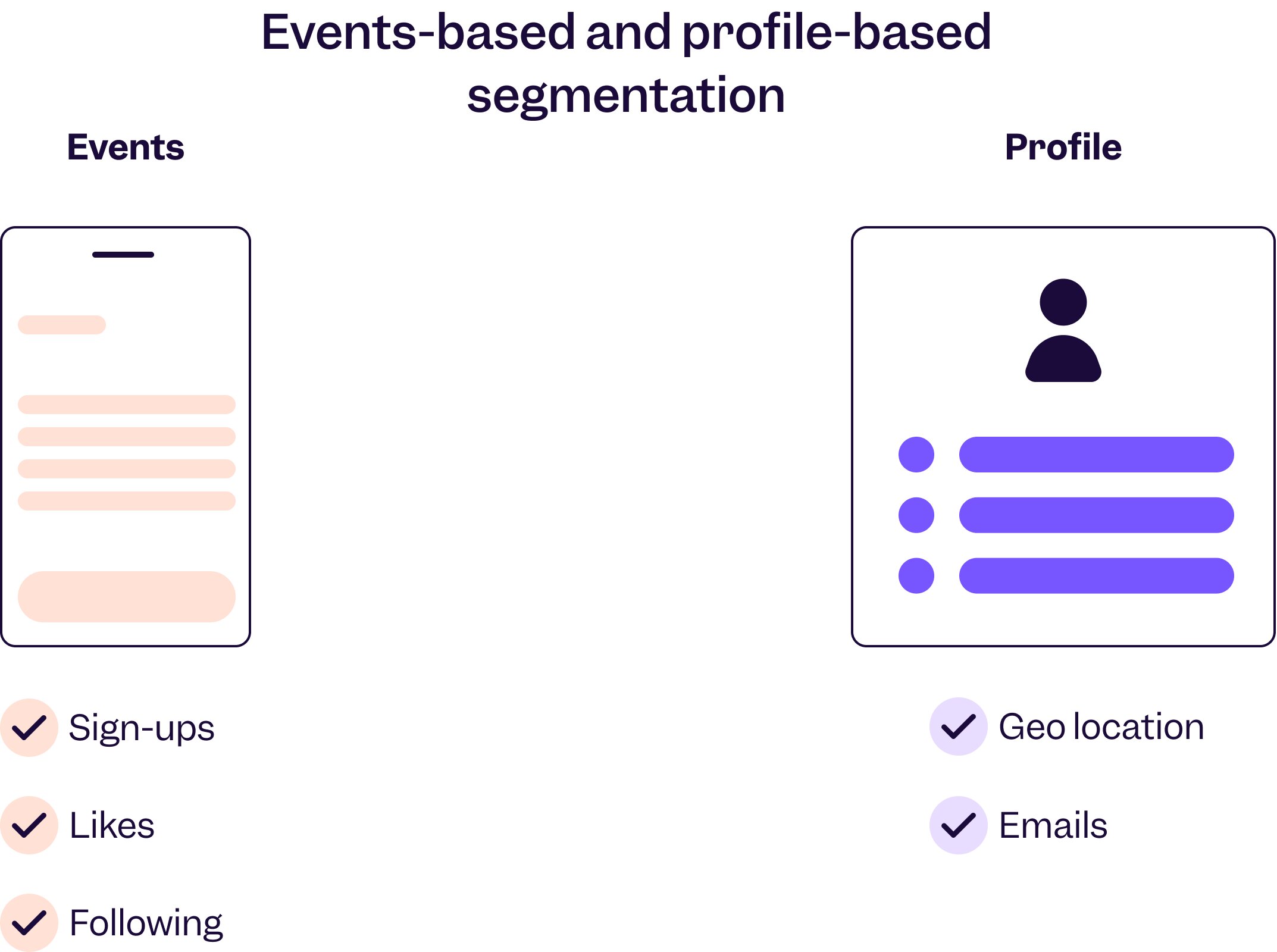 In Mixpanel, each data point is connected to a single user through a unique ID. Events are interactions between a user and your product. These are things users do, like signing up, adding items to cart, liking and following. Profiles store information about who your users are, like where they live (geo), and what email they use to log in.